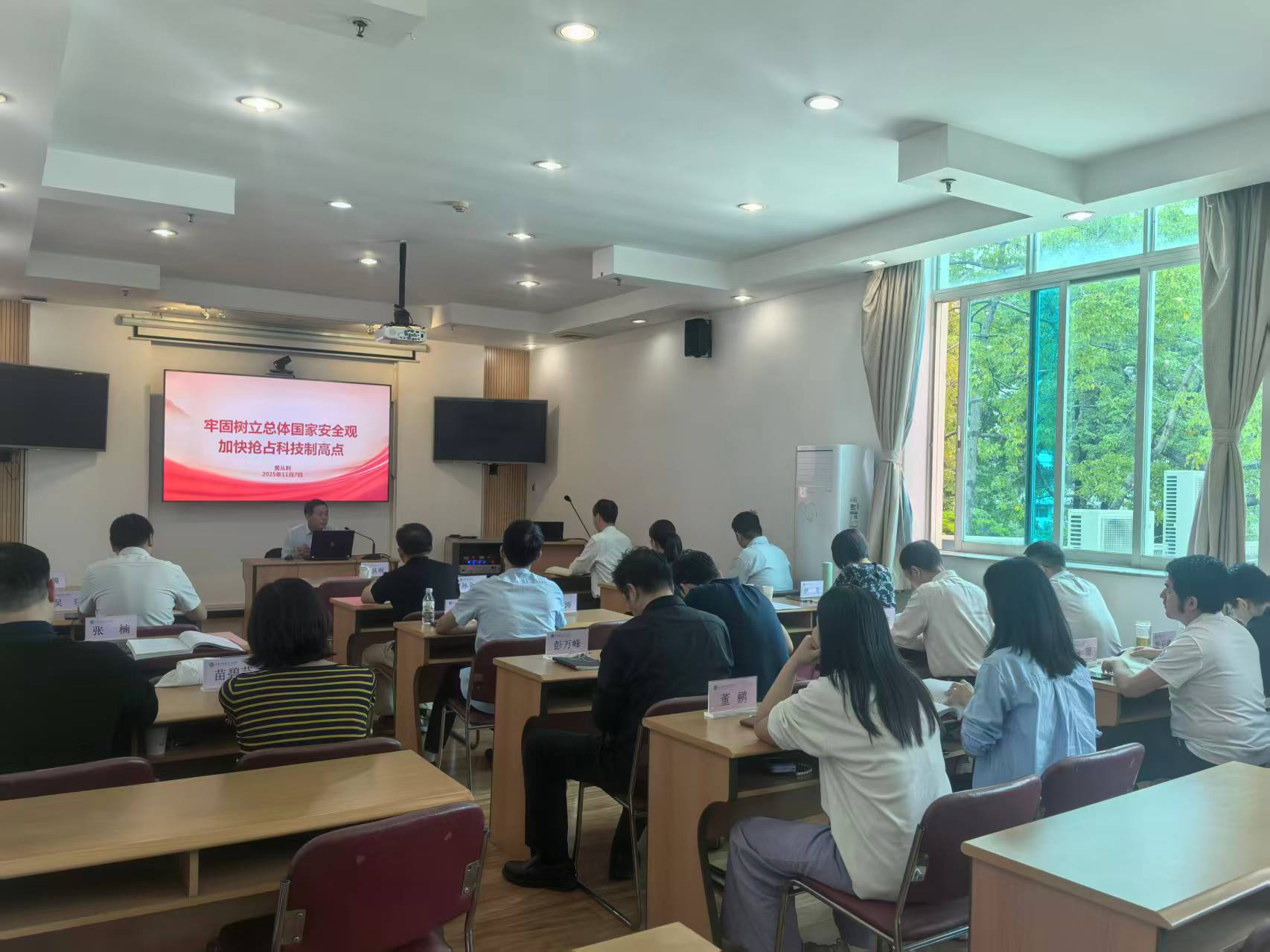 广州分院分党组书记黄从利作安全保密专题党课报告。他以“牢固树立总体国家安全观 加快抢占科技制高点”为题,全面系统领学了习近平总书记关于总体国家安全观的系列重要论述和指示批示精神。黄从利指出,国家安全是国家生存和发展最基本最重要的前提,保证国家安全是治国理政的基本目标。总体国家安全观,就是系统、全面地定位和把握国家安全问题。党的二十届四中全会把“坚持统筹发展和安全”列为“十五五”时期经济社会发展必须遵循的一条重要原则,把“国家安全屏障更加巩固”列为主要目标之一,围绕统筹发展和安全作出一系列战略部署。他强调,广大职工要深刻理解把握总体国家安全观的重大意义,以高度的政治自觉更好统筹发展和安全,树牢安全特别是保密意识,带头严守工作纪律,为加快抢占科技制高点贡献智慧与力量。