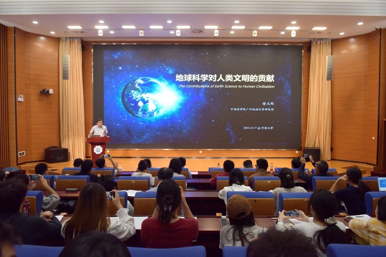 10月17日,河海大学研究生高端讲堂暨庆祝海洋学院独立办学十周年院士讲座在河海大学西康路校区科学会堂三楼报告厅举行。本次讲座邀请中国科学院院士、中国科学院广州地球化学研究所研究员徐义刚,带来题为“地球科学对人类文明的贡献”专题报告。河海大学党委常委、副校长宋翔洲,研究生院常务副院长沈德建,海洋学院副院长赵哲、冯涛,海洋学院副书记吴昊及师生代表190余人共同出席。