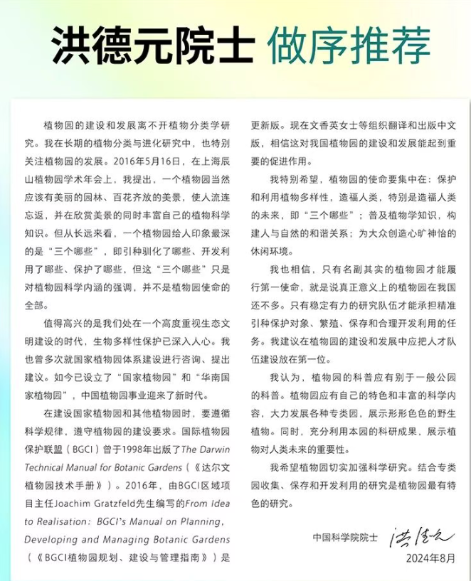 近日,中国科学院华南植物园正高级工程师、BGCI中国项目办公室文香英,北京植物园(现国家植物园北园)原园长、教授级高级工程师赵世伟和国家植物园科普馆副馆长,副研究馆员陈红岩主译的《BGCI植物园规划、建设与管理指南》,由广东科技出版社正式出版发行,著名植物学家洪德元院士作序推荐。