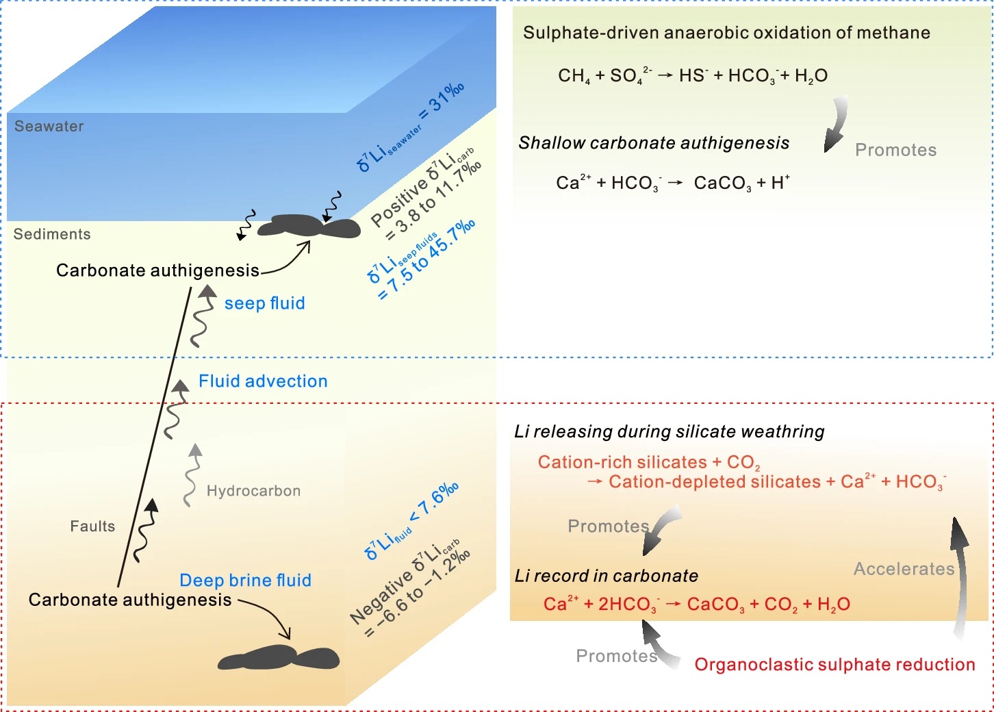 近日,中国科学院南海海洋研究所颜文研究员团队在海洋自生碳酸盐岩沉淀机制方面取得重要新进展。研究团队应用Li同位素等地球化学手段,首次在深部沉积物中捕捉到“有机质硫酸盐还原(OSR)-硅酸盐风化-碳酸盐沉淀”三元耦合的直接证据,为理解埋藏沉积物中的物质循环、深化海洋沉积物的碳埋藏理论框架提供了关键科学支撑,对完善海洋碳汇机制研究具有重要意义。研究成果近期以“Lithium isotopes trace silicate weathering-driven authigenic carbonate formation in marine sediments”为题在线发表在国际知名期刊Communications Earth & Environment上。助理研究员黄慧文为论文第一作者,上海海洋大学副教授宫尚桂和教授冯东为通讯作者,合作者还包括德国汉堡大学的教授J?rn Peckmann和美国莱斯大学的博士孙涛。