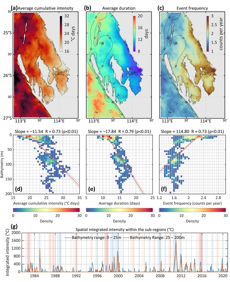 图 1?鲨鱼湾海洋热浪指标的时空特征。(a?c)1981–2020 年海洋热浪事件平均累积强度、持续时间和发生频率的空间分布;(d?f)三者与水深关系的散点密度分布及线性拟合(红色实线,虚线为 95% 置信区间);(g) 湾内(≤ 25 m)与湾外(> 25 m)区域的月平均强度,背景阴影为 NOAA 提供的海洋尼诺指数 (ONI)