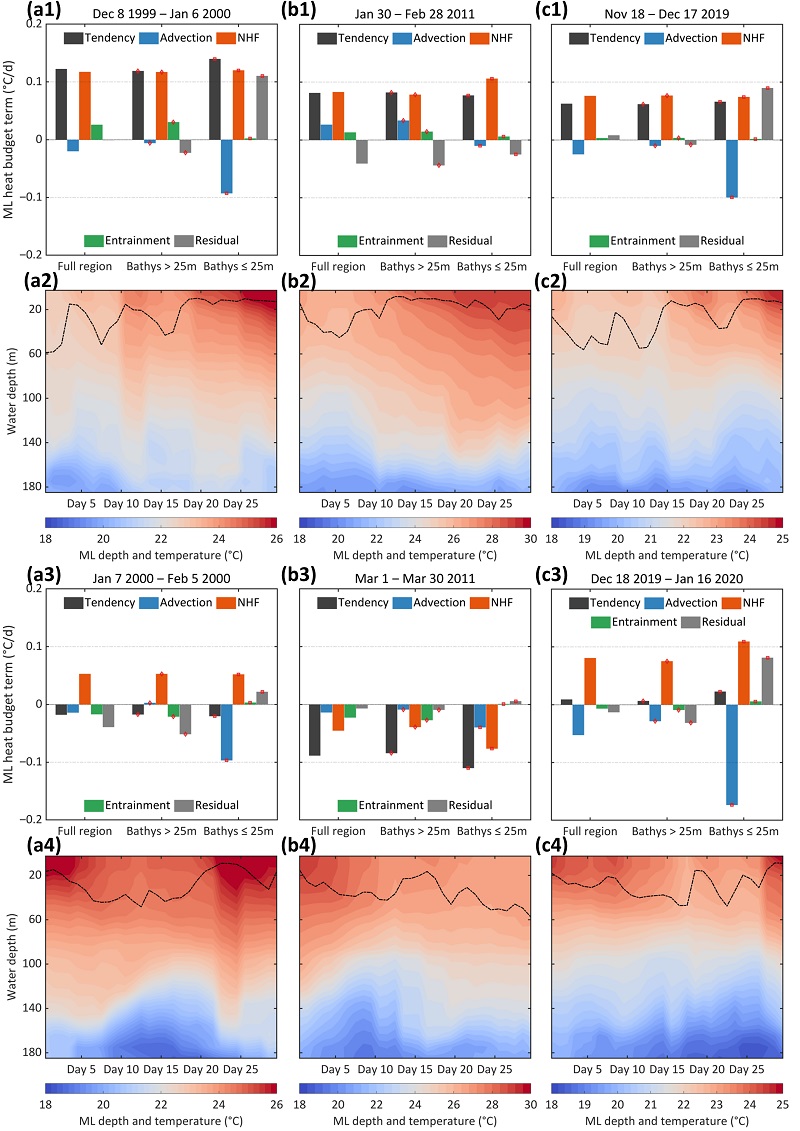 图2?鲨鱼湾混合层热收支。(a1?c2) 2000、2011 和 2019 年海洋热浪事件的形成阶段,(a3?c4)消亡阶段。(a1)2000 年事件形成阶段全区、湾外区域(> 25 m,菱形标记)和湾口区域(≤ 25 m,方形标记)的体积加权温度变化率及水平平流、净热通量、夹卷过程及残差项的贡献;(a2) 同事件的面积加权海洋温度剖面,并叠加混合层深度(MLD,黑色虚线);(a3?a4)与(a1? a2)类似,但为消亡阶段;(b1?b4)与 (a1?a4)类似,但对应 2011 年事件的形成阶段与消亡阶段;(c1?c4)与(a1?a4)类似,但对应 2019 年事件的形成阶段与消亡阶段